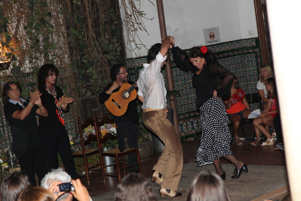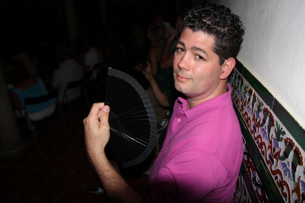 I had researched places to go beforehand and decided on Casa de la Memoria. Luckily, we happened by the place our first day, so we bought tickets in advance. After having experienced the show in the bar earlier, I was really excited to see the professionals. We arrived on time, which evidently was late. It’s located in an interior courtyard with with vines running down behind the stage and tiles adorning the walls. It was a really neat place and it was…surprise!…hot. I bought a fan (you know, a Spanish fan) earlier in the day, and it got put to good use here. (It ended up being quite a useful purchase!)
