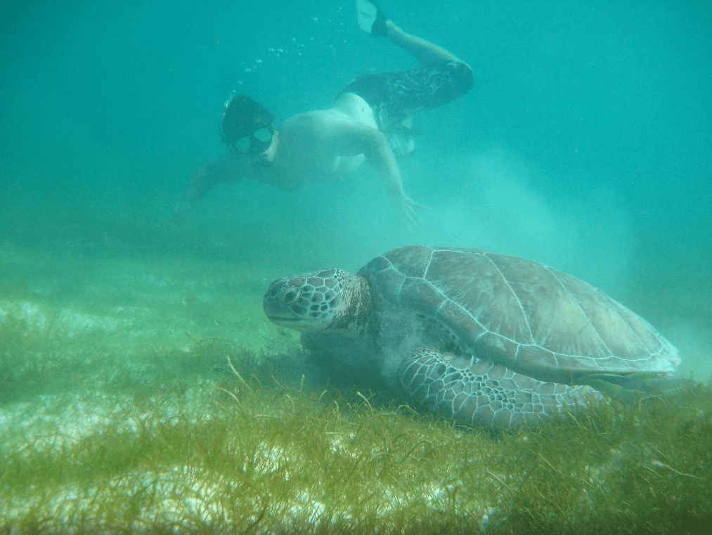 After lunch, we headed out to the beach for our swim with the turtles. This area in Akumal is regulated to protect the wildlife, so we were paired with a guide from there. So we set off of from the beach with two guides (not bad for two people, right?). It’s a beautiful, calm beach so swimming straight off the beach is easy. The first thing we spotted was a manta ray de aguila (eagle ray?) and according to our guides, they aren’t that easy to spot. Then, we saw the turtles. It is something everyone should see. It’s crazy how big they are. They are just beautiful and so peaceful swimming through the water. Seeing them come up for air is neat and one came right up by me — I didn’t move a muscle and just watched. I really tried to enjoy every moment.