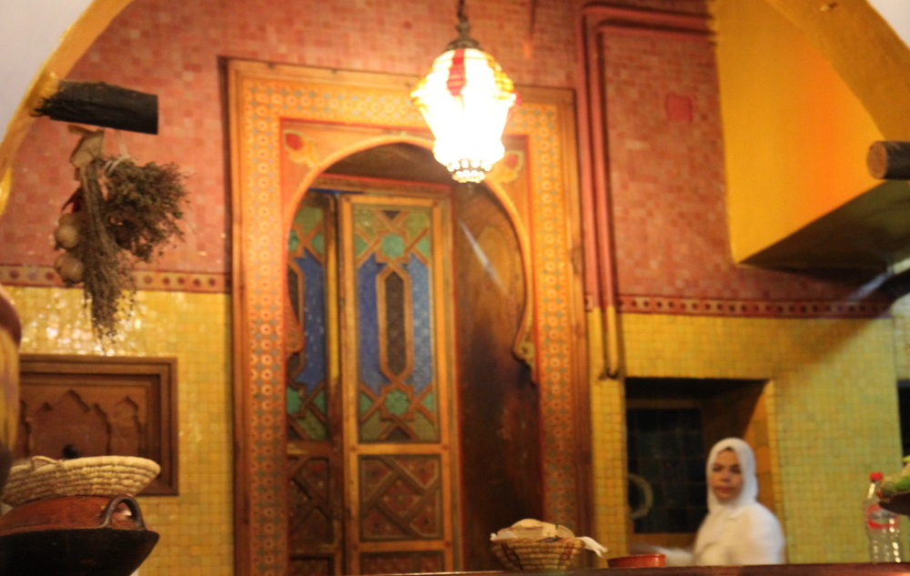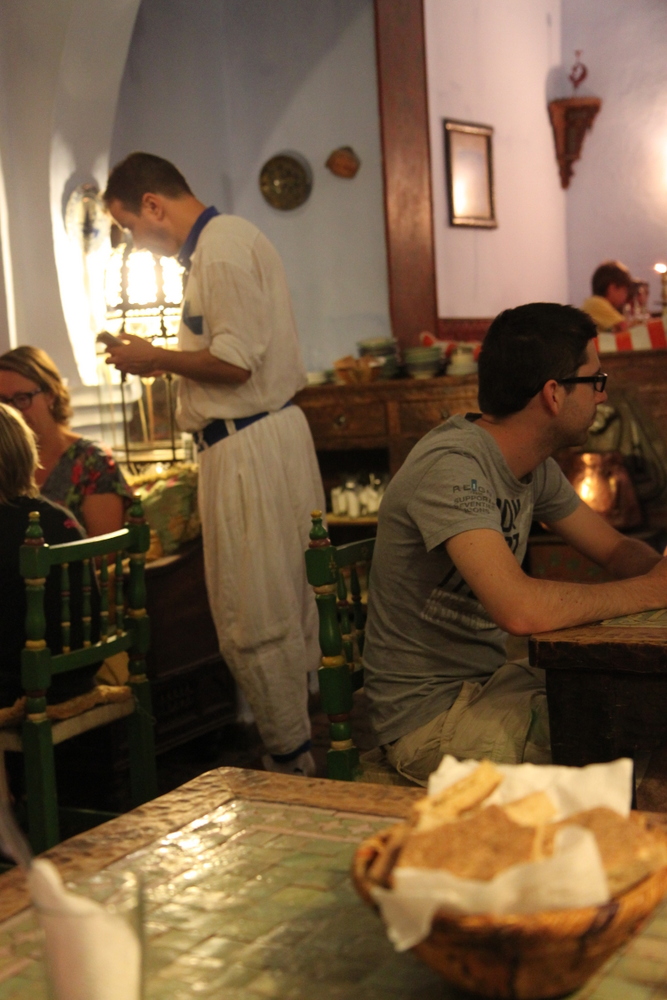 Our hotel suggested Casa Hassan for dinner and so we went there. (I had also read it was good.) We got there and they told us they were closed. Not knowing where else to go, we went back to the hotel to ask. He says, “Oh yea, it’s Ramadan. Everything is closed.” I’m thinking, uh-oh. But he says they should open up later after it’s dark and after they’ve had a chance to break their fast. So, we went out and found one small street vendor and bought Pringles, yogurt and Coke. I was afraid this might be our only meal and was terribly disappointed as I’d been looking forward to Moroccan food. We gobbled down our snacks, played on the internet and later went back out again. Success! They’re open this time.