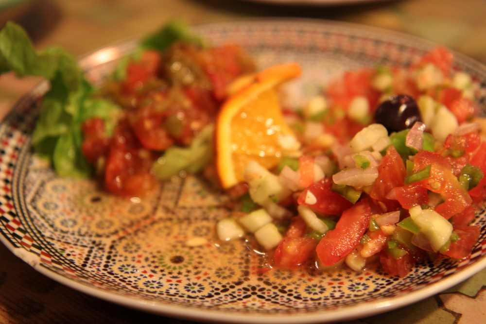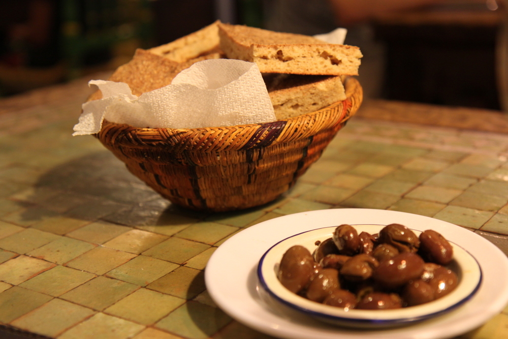 The inside of the restaurant is really pretty with massive lanterns, wood and tile tables and pretty arches. The waiters wear the typical harem pants, which I love. You can see the kitchen through a huge arch and you see the women wearing white headscarves scurrying around preparing the food. First, they brought bread out to the table and a bowl of olives.