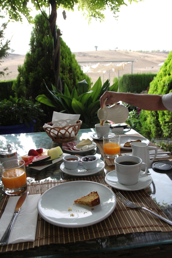 Breakfast is included here and was a highlight for me as it’s my favorite meal of the day anyway. So, to be served breakfast on a garden terrace, as you gaze out at the countryside and the grazing horses, was heavenly to me. They served a plate of meats and cheeses, a plate of fruit, a bread basket with assorted jams, fresh-squeezed orange juice and coffee. Such a great way to start the day!