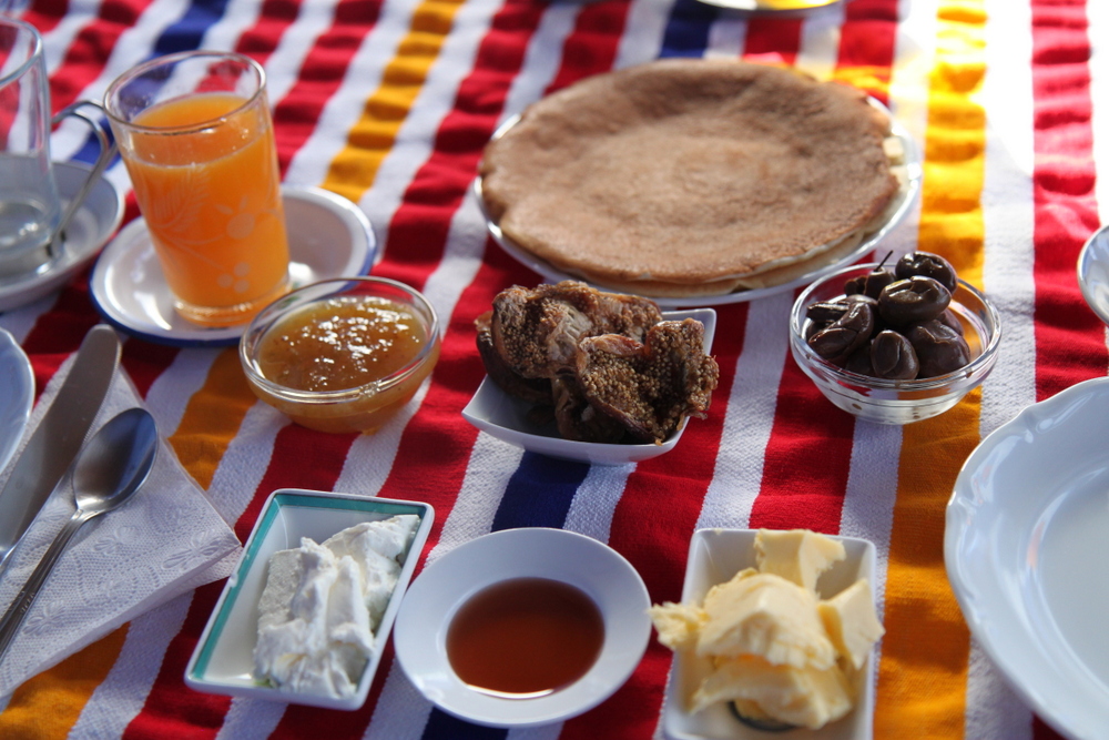 On our second day in Morocco, I woke up early and eager to get out and explore some more before we had to leave. But, first we had an amazing breakfast at our hotel. They served Moroccan pancakes, which were so good and kind of like a thick crepe. They were served with goat cheese, honey, jam, butter, figs, etc. And, of course, the coffee was wonderful.